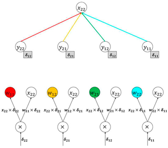 For the gradient of the filter, the first element of the inflow gradient matrix, , is connected with , , , and . Hence, the gradient of the filter can be determined by multiplying the inflow gradient (, , , ) by the local gradient. Equation (4) is the equation used to obtain the slope of weight .