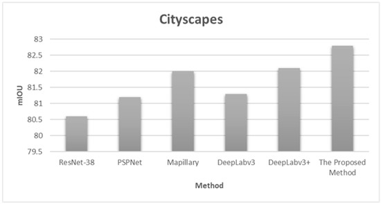 Figure 16 graphically compares the accuracy (mIOU) for the proposed method and other algorithms that were evaluated in the same environment by Chen et al. [32]. The figure confirms that the semantic segmentation method proposed in this paper had a higher accuracy than the other semantic segmentation methods. Figure 17 shows the experimental results of the semantic segmentation method proposed in this paper for the Cityscapes database.