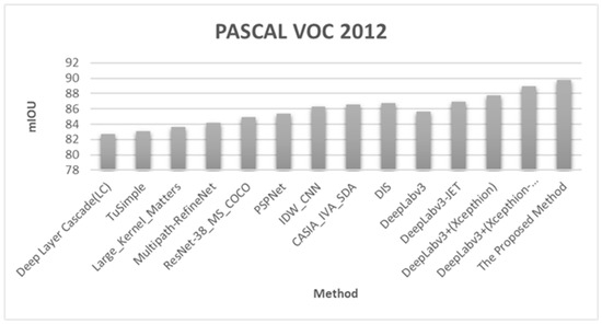 Figure 18 graphically compares the accuracy results for the proposed method and the other methods evaluated by Chen et al. [32] in the same environment for the images of the PASCAL VOC 2012 database. The figure confirms that the proposed method had a higher accuracy than the other methods. Figure 19 shows the experimental results of the proposed semantic segmentation method for the PASCALVOC 2012 database.