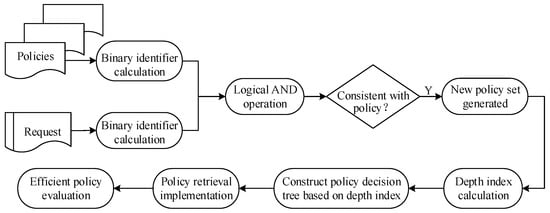 In summary, the policy retrieval based on binary identifiers reduced the scale of the policy, and the policy decision tree retrieval based on the depth index achieved the rapid matching of the policies. Therefore, the policy retrieval method based on attribute and attribute value levels proposed in this paper had a higher efficiency, and the two retrieval methods improved the efficiency of policy evaluation at the levels of attribute and attribute value, respectively. The implementation process is shown in Figure 4.