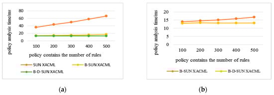 The results above show the time consumption of policy analysis and evaluation when the number of rules increase. These series of experiments increased the number of rules contained in the policy from 100 to 500, and averaged the results of five experiments on multiple requests. From Figure 5a and Figure 6, it can be seen that the efficiency of the algorithm in this paper has obvious advantages, where the analysis efficiency was 2–3 times higher than the classical algorithm and for evaluation efficiency, B-Sun XACML was twice as efficient, while B-D-Sun XACML was 3 to 5 times higher. Figure 5b shows the difference of policy analysis time between B-D-Sun XACML and B-Sun XACML. The time consumption of the classical algorithm increased with the increase in the number of rules, while the algorithm in this paper tended to be flat, so the scalability was relatively strong.