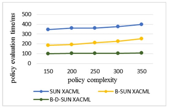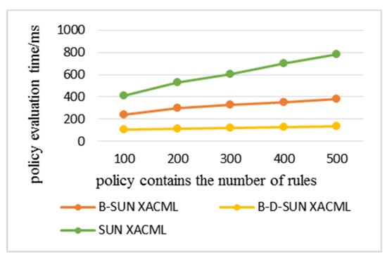 In the following experimental results, Sun XACML refers to the classic algorithm that needs to traverse all the policies in the policy set when evaluating the policy. B-Sun XACML adopts the policy retrieval method based on the binary identifier. B-D-Sun XACML adopts the policy retrieval method based on attribute and value levels, which superimpose the policy decision tree retrieval method based on depth index on B-Sun XACML. The experimental comparison was based on the policy evaluation for the same access request. The more the number of policy retrievals, the longer the time spent.