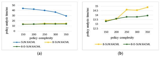 The policy analysis time varies with the increasing complexity of the policy. (a) Comparison of B-Sun XACML and B-D-Sun XACML with Sun XACML; (b) Detailed comparison between B-Sun XACML and B-D-Sun XACML.