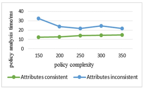 Statistics were made on the time consumption of each algorithm when the number of rules in the policy increased and the complexity of the policy increased during the simulation. All data were the average results of multiple experiments on multiple requests. The policy complexity refers to the number of avp included in the policy; the policy analysis time refers to the time consumed by the PDP to analyze the attributes and their URN, attribute values, and their data types step-by-step in the policy. The policy evaluation time refers to the total time that PDP retrieves the policies to find the policies matching the access request and gives the response result.