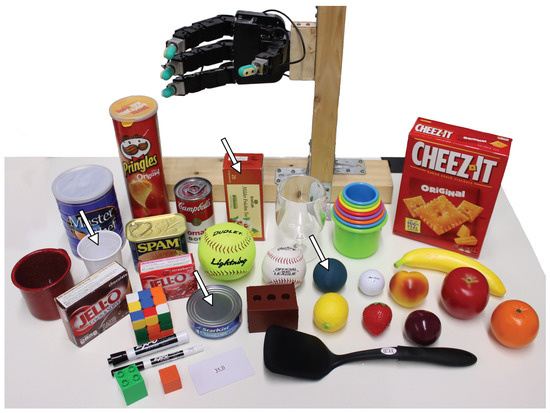 - Calli, B.; Singh, A.; Walsman, A.; Srinivasa, S.; Abbeel, P.; Dollar, A.M. The YCB object and model set: Towards common benchmarks for manipulation research. In Proceedings of the IEEE International Conference on Advanced Robotics (ICAR), Istanbul, Turkey, 27–31 July 2015; pp. 510–517. [Google Scholar]