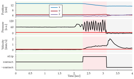 Figure 3 shows a representative, single training trial with data from the index finger. Slip labels were generated automatically from the finger’s end-effector location and the recorded pressure values. The total shift in Cartesian position was calculated from the end-effector position. Since the object was fixated during training, we defined slipping as the state when the finger was in contact (i.e., the recorded pressure was above a certain threshold ) and the finger was moving (i.e., the finger velocity exceeded the movement threshold ; both thresholds are indicated with dashed lines in Figure 3).