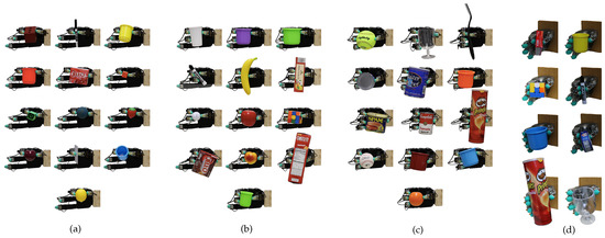 Stable grasps on a variety of objects. The specific grasp configurations varied from trial-to-trial but always resulted in stable grasps. The figure shows (a) two-finger, (b) three-finger and (c) four-finger grasps with the Allegro Hand and (d) two-finger, three-finger, four-finger and five-finger grasps with the Wessling Robotic Hand respectively from the first to the bottom lines.