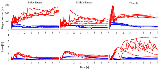 Pressure and force profiles. A comparatively light object (plastic mug; blue lines) or a heavy object (cracker box; red lines) was grasped five times with the Allegro Hand (first row) and the Wessling Robotic Hand (second row). While all attempts resulted in stable grasps, the exact configuration varied with the fingertip pressures and forces changing accordingly.