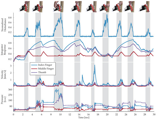 The magnitude of the external perturbations (top panel), the resulting integrator responses (second panel), changes in fingertip positions (third panel), and the fingertip pressures (bottom panel) during a full 30 second experimental run. Early pressure changes represent the initial stabilization of the object in-hand. Subsequently, the individual fingertip pressures dynamically and independently change and the integrator response increases every time that the object was perturbed by the experimenter (top panel), or, interestingly, by ’spontaneous’ changes in individual fingers (e.g., around 17 seconds).
