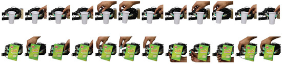 Our set of 38 test objects belonged with two exceptions (a tea box and a plastic cup) to the YCB object set [38], and are shown in Figure 2. Among the test objects, the weight varied from 10 g to more than 400 g and grasp width from less than 10 mm to more than 100 mm. Specifically, the plastic cup was included to assess the performance of the control system when faced with highly deformable objects.
