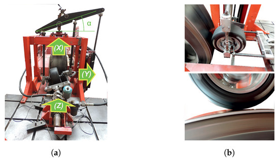 The experimental measurements were carried out in an indoor tri-axial tire test rig at the Vehicle Dynamics Laboratory, University of Birmingham. Figure 1a shows the axis coordinate system fixed on the test rig and, it also pointed out the instrument used to change the slip angle of the tire. The instrumented tire makes contact with the drum’s surface and, its vertical load is controlled by the actuation of a hydraulic cylinder on it in the Z direction, as is shown in Figure 1b. As an advantage, this sort of test rig allows accurate control of the tire’s operational conditions. The tire test rig is formed by a drum with a large diameter (2440 mm). The effect of the drum ’s curved surface introduces a small average error in the tire contact patch, being proper to approximate it as a flat contact surface [31,47]. The test rig has a group of actuators which can vary the tire position against the drum.