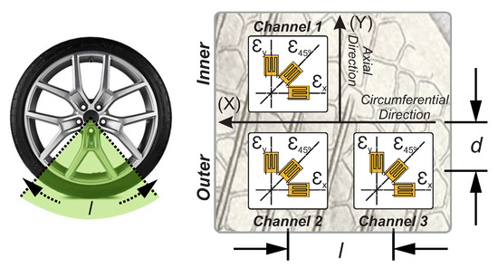 The strain gauges were placed on the inner liner of the tire tread band as shown in Figure 2. It is formed by three rectangular rosette strain gauges attached to the tire inner surface in longitudinal and lateral directions. Two of them are located in the same cross-section at the external side and the third one, at the inner side, of the tire tread. The distances “d” and “l” are about 40 mm and 515 mm, respectively. The strain gauge’s length is 2 mm.