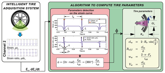 To facilitate the understanding of the work done, Figure 4 shows the workflow to implement the proposed methodology to estimate the parameters of the tire in real-time conditions. The module of intelligent tire acquisition system describes the process to acquire strain measurements in the circumferential direction and calculate its time rate. The module Algorithm to compute tire parameters is split into two sections, the first one denoted as Parameters detection on the strain curve explains the selection of the points of interest on the strain and strain ratio curve and also the estimation of the central angle (); , in the other section, Tire parameters, the tire parameters are computed through the equations of , , as shown. This process is explained in detail in Section 3.2.
