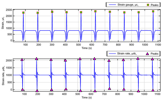 The nomenclature used to refer to the key points or parameters of the strain curves is shown in Figure 5. The maximum tensile strain values are denoted as and are indicated by green squares on the strain curve, while on the time derivative curve, maximum peaks are indicated as and shown by purple triangles.