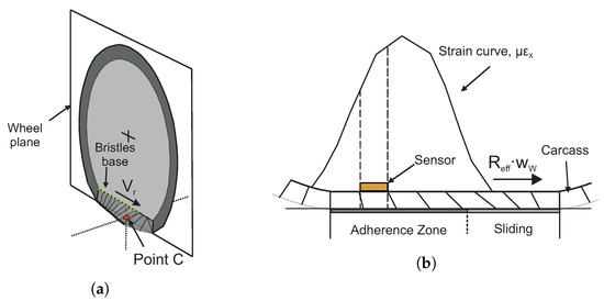 According to Pacejka [52], the brush model explains the interaction of the tire tread elements, called as bristles, with the road surface. It explains that when the tire rolls the bristles experience a deflection in a direction parallel to the road surface where the tread elements move from the leading edge to the trailing edge. A hypothetical situation is to assume the strain curve of the measurement point (where the strain sensor is placed) as the strain suffered by a tip element of the tread band, since the strain measure is taken at the base of a bristle. The tip remains adhered to the ground under the condition of the available friction. Simultaneously, the base point of the bristle remains in the wheel plane and moves backward with the linear speed of rolling with respect to the contact center C (see Figure 9). However, the bristle’s base, with respect to the road, moves with a velocity that is designated as the slip speed of the wheel.