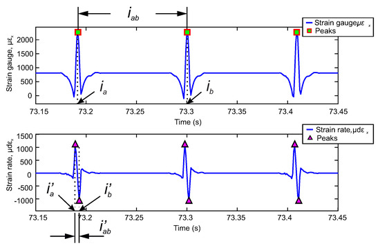Therefore, the linear equivalent of the tire’s rotational speed can be computed by the ratio of the contact length and the time it takes for an element to move through it. The time that elapses when a point passes through the contact length can be calculated from the time derivative of the strain curve (see Figure 10). In this study it is assumed that the distance from peak to peak in the strain rate curve is equivalent to the time requested in Rajamani [51].