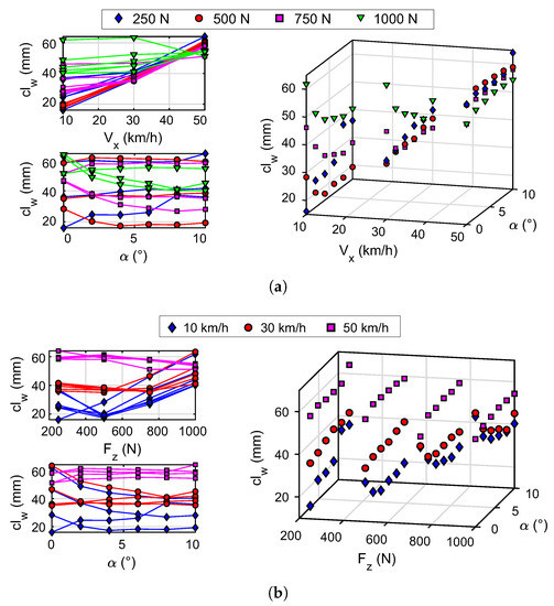 Figure 11b illustrates the results of with and as the dependent axes and, the data colored is in line with . This shows that the increase in vertical load also produces a convergence of the contact length to a constant value. This parameter converges to a value between 40 mm and 60 mm for a vertical load value of 1000 N. At lower speeds the influence of the vertical load is greater; this influence is lower at higher speeds, i.e., at 30 km/h and 50 km/h. In addition, it is evident that speed stratifies the contact length values independently of the values of and . These layers (stratification) tend to converge to the value mentioned above. About the slip angle, it is observed that its influence on the contact length is smaller at higher speed.