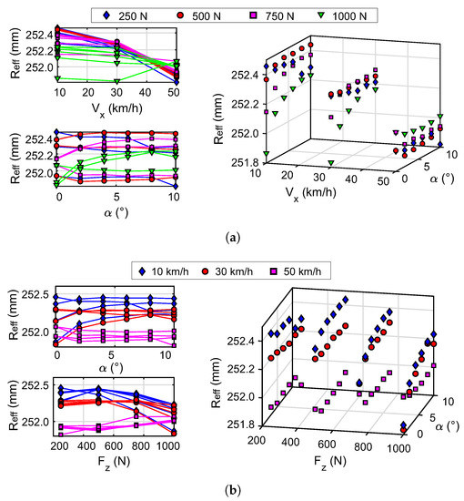 Figure 12 shows that has a similar but inverse behavior to that shown by . Thus, the analysis of Figure 11 can apply to Figure 12. The results of the effective radius for the conditions tested are shown in Figure 12a. Similarly to the contact length, the magnitude of the effective radius converges to closer values when increasing the speed of the wheel. For the tested speed of 50 km/h this parameter tends to a value between 251.8 mm and 252.1 mm. It can be seen that the increase in the slip angle reproduces the trend to a constant value, which is highly varying or more abrupt with increasing vertical load. This behavior is clearly seen at speeds of 10 km/h and 30 km/h. Figure 12b shows how the speed stratifies the values of the effective radius. The layers (stratification) observed in the effective radius converge to values between 251.8 mm and 252.2 mm for 1000 N.