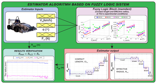 Tires are essential components of vehicles and are able to transmit traction and braking forces to the contact patch, contribute to directional stability, and also help to absorb shocks. If these components can provide information related to the tire–road interaction, vehicle safety can be increased. This research is focused on developing the tire as an active sensor capable to provide its functional parameters. Therefore, in this work, we studied strain-based measurements on the contact patch to develop an algorithm to compute the wheel velocity at the contact point, the effective rolling radius and the contact length on dynamic situations. These parameters directly influence the dynamics of wheel behavior which nowadays is not clearly defined. Herein, hypotheses have been assumed based on previous studies to develop the algorithm. The results expose to view an experimental test regarding influence of the tire operational condition (slip angle, vertical load, and rolling velocity) onto the computed parameters. This information is used to feed a fuzzy logic system capable of estimating the effective radius and contact length. Furthermore, a verification process has been carried out using CarSim simulation software to get the inputs for the fuzzy logic system at complex maneuvers.