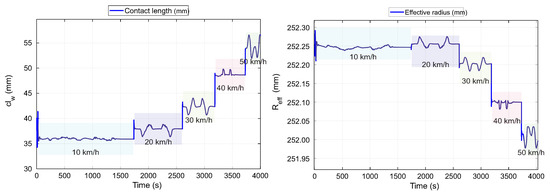 The process of detecting strain parameters is carried out for each experimental condition. The experimental data enables the calculation of the effective radius, contact length, and velocity in the tire’s contact patch under controlled conditions. As a result, it is possible to assess the effects of the tire’s working conditions on the estimated parameters.