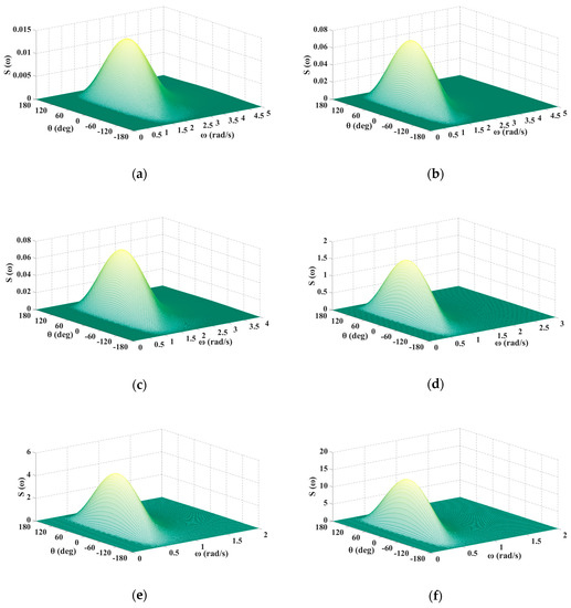 The actual wave surface is three-dimensional, which means that its energy is not only distributed in a certain frequency range, but also in a certain direction range. However, the PM spectrum is a kind of one-dimensional spectrum that can only describe the distribution of energy with frequency. Therefore, a directional spreading function was defined to more accurately describe the energy distribution of three-dimensional waves, which is denoted as and shown as follows.