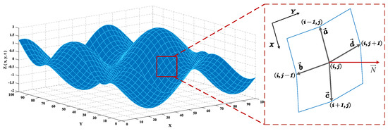 Each mesh node on the wave surface is adjacent to four mesh nodes: , and is the intersection of the four surrounding mesh elements, each of which has an independent normal vector, as shown in Figure 3.