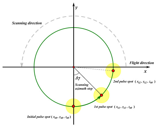 Figure 5 shows the laser scanning process from the top view. For the convenience of analysis, the plane was set to fly in the positive direction of the axis with a flight speed of ; The LiDAR was scanning in the counterclockwise direction with a scanning frequency of in revolutions per second, which indicates the number of scanning trajectory circles per second.