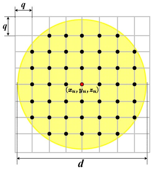 where indicates the coordinates of these internal nodes; is the spot diameter given by Equation (16); and is the step size of the wave mesh mentioned in Section 2.1.2.