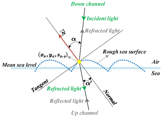 It can be seen that was extremely small, so the motion of the wave in this period can be ignored. It is considered that the wave was practically stationary in this time between the two transmissions. As a result, the light paths of the down channel and the up channel were reversed, and the laser light lines along the two channels passed through the same incident point on the rough sea surface, which is shown in Figure 8.