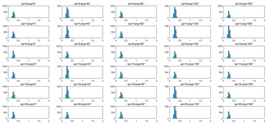 From the statistical results of the refraction angles of pulse spots shown in Table 5, we can see that the refraction angles under each wind condition were concentrated between 0.14 rad and 0.38 rad; Furthermore, Figure 9 shows that the distributions of refraction angles under each wind condition were consistent with the Gaussian distribution. For each wind condition, more than 90% of the pulse spot refraction angles were distributed in three bins of [0.1848 rad, 0.3234 rad], and the maximum frequency was in the bin of [0.2310 rad, 0.2772 rad].