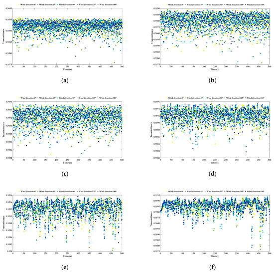 We set the coordinate of the aircraft at initial time as ; The step size of the mesh is set as ; In the first 100 s, we took a pulse spot every 0.1 s, and computed the transmittance of the 1000 pulse spots in different typical wind speeds and wind directions. The simulation environment is shown in Table 2. We took the working condition parameters of mainstream airborne LiDAR systems as the simulation parameters, as shown in Table 3.