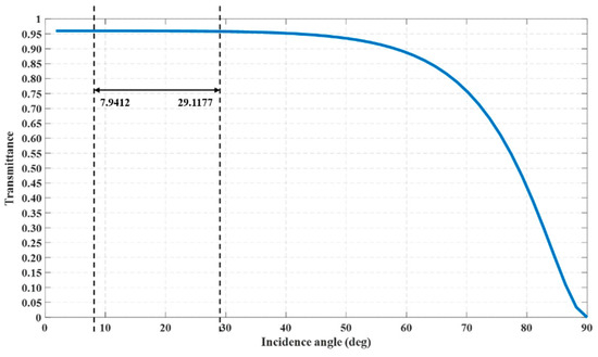 Firstly, we can obtain the relationship between the transmittance and the incident angle of the down channel based on the computational process given by Equations (30)–(36), as shown in Figure 11.