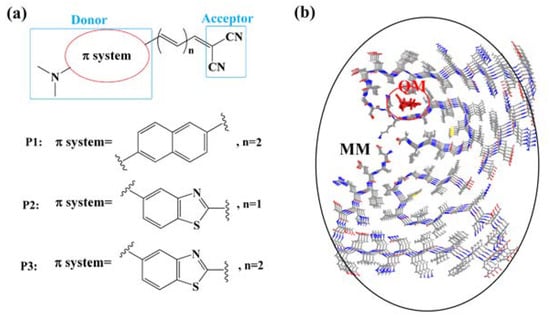 Molecular structures of the probes studied in this paper (hereafter referred to as P1, P2, and P3) are shown in Figure 1a. Even though the probes investigated herein have been reported as successful diagnostic agents for fluorescence imaging toward β-amyloid [,], our motivation lies in characterizing the potential of these molecules to be two-photon probes for β-amyloid in Alzheimer’s disease. Additionally, we aim to set out possible structure–property relationships for the future design of improved diagnostic probes by analyzing the effect of donor moieties and the length of spacers on the sensing performance of the probes. To this end, another three derivatives of the same series named P4, P5, and P6 (see Figure S1) are investigated, and only the first three with a higher affinity are reported in this text. The binding profile, as well as the β-amyloid-specific optical properties, will be discussed in detail by employing the combined molecular docking simulation and quantum mechanics/molecular mechanics (QM/MM) calculations.