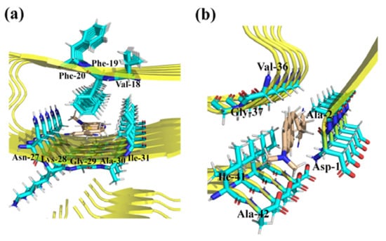 Amyloid-ligand configurations were optimized using the QM/MM method with the two-layer ONIOM approach []. The ligand was regarded as the high layer and handled by the QM method, while the β-amyloid was treated as the MM part and defined to be the low layer (see Figure 1b). When performing ONIOM calculations, the universal force field (UFF) was adopted for the MM part and the B3LYP functional with the 6-31+G(d,p) basis set was chosen for the QM part. Besides, the electronic embedding scheme was used in the QM/MM calculations, where the wave function of the QM part was polarized by the MM point charges []. The MM part was frozen during the geometry optimizations, and frequency calculations were then performed to verify the stability of the optimized structures.