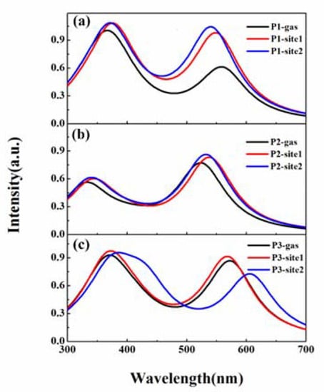 In view of multiple binding modes found for the probes toward β-amyloid, one can expect that molecular photophysical properties may feature a combined effect over contributions from different sites. We computed OPA spectra for the probes in different binding sites, and the spectrum in vacuum is also shown as a reference in Figure 4. Obviously, there are two absorption bands with high intensity for P1, P2, and P3 both in the gas phase and in β-amyloid, which are located at wavelengths around 350 and 550 nm, respectively.