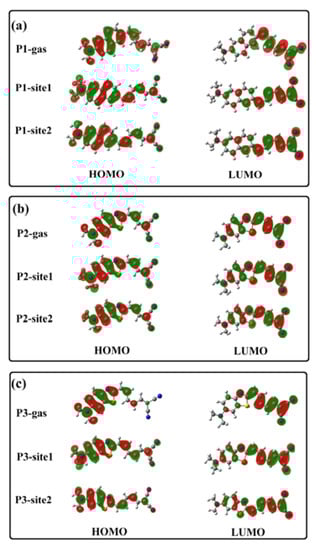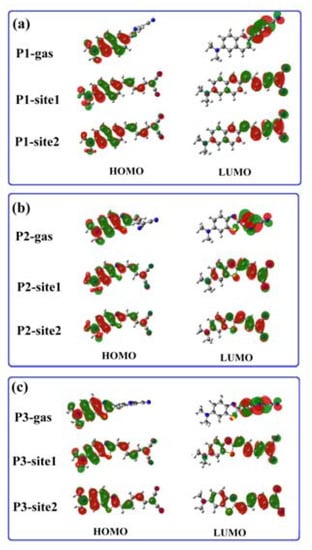 HOMO and LUMO for (a) P1, (b) P2, and (c) P3 in the ground state in different microenvironments.