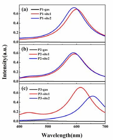 To investigate the feasibility for the dyes to detect β-amyloid as a fluorescent sensor, OPE properties of the probes in different microenvironments are investigated by optimizing the molecular geometry in the first excited state using the QM/MM method. One can see from the emission spectra in Figure 6 and Table S3 that the fluorescence of the probes is quenched in the gas phase, while it is increased significantly in β-amyloid. This off–on transformation on the fluorescent signal of the probes appears to be in good agreement with the experimental observations. Within β-amyloid, the maximum emission wavelengths for P1 in site1 and site2 are respectively 600 and 591 nm. By replacing the donor moiety with benzothiazole in P1, the emission maxima are shifted to 593 nm (589 nm) for P2 and 614 nm (656 nm) for P3 in site1 (site2). Although these values are smaller than the experimental results of 660 nm for P2 and 710 nm for P3 [], the lengthened trend of emission wavelength for the push–pull-type dyes by increasing the number of conjugated double bonds is reproduced well (see Table S3) []. In general, the numerical discrepancy can be attributed to the flexibility of the β-amyloid and nuclear motion of the probe that are not included in our treatment.