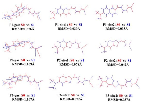 Geometry changes between the ground state and the first excited state for P1, P2, and P3 in different microenvironments.
