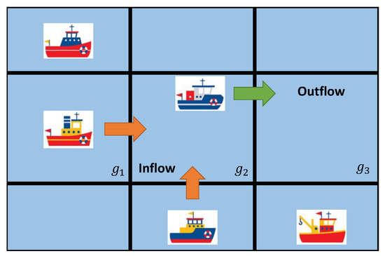Our target is to forecast the inflow and outflow of vessels within a given area. To this end, we first divide this area into grids. Thus, the inflow and outflow at a time step can be represented by two matrix, respectively, and the element of which refers to the counts of vessels entering or leaving the corresponding grid during that time step. In this regard, our task comes down to predict the inflow matrix and outflow matrix using the historical traffic flow data. Formally, given the historical observations , our task is to predict , where and is an integer. In particular, , where and represent the inflow matrix and outflow matrix at time step t, respectively. Taking Figure 1 as an example, at time step t, two vessels will enter grid , and one vessel will leave, then = 2, and = 1, respectively.