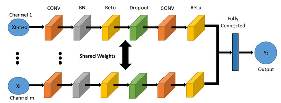 where refers to the output of the filter in the layer; refers to the output of the filter of the preceding layer; and refers to the weights and bias; ∗ refers to the convolution operation. Besides, the BN layer is used to scale the range of feature values; the ReLu layer acts as the activation function; the Dropout layer is used to select the salient features from the receptive region, so as to avoid redundant features and reduce the scale of the computation; and the output layer generates both inflow and outflow matrix that we would like to predict. To adopt the CNN based solution to solve the vessel flow forecasting problem, we take to as the inputs at time step t and as the output .