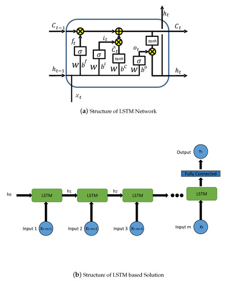 More specifically, the structure of a single layer LSTM network is depicted in Figure 3a. And the LSTM network updates itself at time step t as follows [38]:
