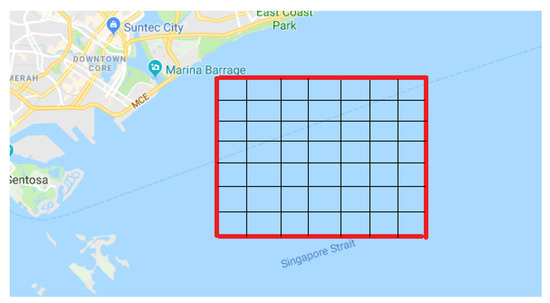 We use the AIS (Automatic Identification System) data of maritime vessels to perform the forecasting task, which is an automatic tracking system that uses transponders on ships to generate trajectory-related information [30]. The AIS data for a vessel contains many useful attributes regarding its movement and mobility, which can be obtained from https://www.marinetraffic.com. Here we mainly exploit the information of vessel ID, coordinates (i.e., longitude and latitude) and time stamp. The testing filed we selected is an rectangle marine area southeast to Singapore, which is shown as the red rectangle in Figure 5. The location of the left upper point is (, ), and that of the right lower point is (, ). In all the experimentation we conducted, we uniformly divided this area into grids (i.e., ), which means that both inflow matrix and outflow matrix have a size of .