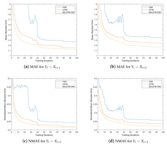 From Figure 6c,d, we can see that they share similar pattern with Figure 6a,b. This is normal because they are simply the normalized version of the latter, which can be regarded as a kind of error rate. The difference in the curve shape comes from the fact that we only show part of errors in Figure 6a,b, in order to highlight the region of interests. Looking into Figure 6c,d, we can observe that, the three solutions achieve error rates (in terms of MAE) of around 24.5%, 22.5% and 22.0%, respectively, for , and around 26%, 24% and 22.5%, respectively, for , with the hybrid solution being the lowest. The error rates in terms of MAE would be decreased about 1.5%, 1.5% and 0.5%. So it can be concluded that the results of three deep learning based solutions considerably are better than the traditional approach expressed in MAE, with the performance of the BDLSTM-CNN based hybrid solution being the smallest.