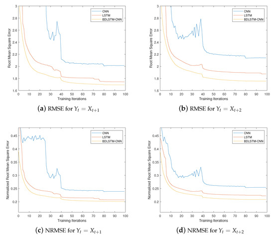Likewise, we also use the RMSE (root mean square error) to further evaluate the proposed solutions, and the results are depicted in Figure 7, which share similar pattern with that of Figure 6. From Figure 7a,b, we can observe that, the three solutions achieve a RMSE of around 2.01, 1.75 and 1.68 for , respectively, and around 2.18, 1.88 and 1.75 for , respectively, with the hybrid solution being the lowest for both cases. From Figure 7c,d, we can see that, the three solutions achieve error rates (in terms of RMSE) of around 24%, 21% and 20%, respectively, for , and around 26%, 23.5% and 21%, respectively, for , with the hybrid solution being the lowest for both cases. Similarly, the error rates in terms of RMSE will be lowered by 2%, 2.5% and 1%. Consequently, it can be found that the outcomes of three deep learning based solutions noticeably outperformed than the traditional approach in terms of RMSE, with the performance of the BDLSTM-CNN based hybrid solution being the lowest.