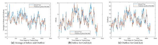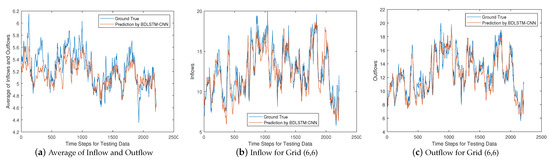 We first plot the above forecasting values against the ground truth for in Figure 8. From Figure 8a we can see that, the ground truth value of the average by considering inflow and outflow together, changes dramatically as time goes on. However, the BDLSTM-CNN based solution can well capture those trends, such as the sharp changes at time step 100, 1300, 1700 and 2200, respectively, because this hybrid solution combines the advantages of the capability of CNN and BDLSTM, to learn the spatial and temporal features in a unified way. Nevertheless, we observe some imperfect tracking, such as time step 250, which does not catch the crest. However, considering that the ground truth is the average of both inflow and outflow for the whole given area, some minor errors are tolerable. We also plot the forecasting curves of a single grid for inflow and outflow in Figure 8b,c, respectively, by taking grid (6,6) as an example. From Figure 8b, we observe that, the hybrid solution can catch most of the crests and troughs for the inflow curve, no matter how sharp or smooth they are, such as the crest at time step 400 and the trough at time step 1250. An unsatisfactory forecasting is found as well at time step 1800, where a sharp crest is missed. From Figure 8c, we observe that the hybrid solution can also successfully follow both sharp and smooth crests and troughs for the outflow curve, such as the crest at time step 1050, and trough at time step 1450. Although the hybrid solution mismatched the ground truth at some points, such as time step 1800, most of the failures are tolerable.