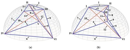 As a result, the incident matrix and for the forms of the rotationally symmetric prism-shaped tensegrity as illustrated in Figure 1a,b are separately written as: