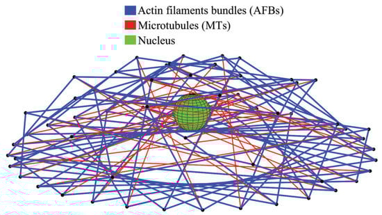 The observation and investigation of the intracellular microstructure in eukaryotic cells proved that the interconnected framework of discrete cytoskeleton plays a critical roles in cell’s mechanics [,]. Cytoskeletal components were shown to be pre-stressed, which led to the development of the self-equilibrium tensegrity structure for describing the cytoskeleton framework [,,]. Therefore, tensegrity models were established by the microstructural approach. Within the cytoskeleton, the MTs resist the compression, while the actin filaments and intermediate filaments resist tension only []. In most adherent cells, actin filaments were observed to organise into higher-order structure as thick actin filaments bundles (AFBs) []. For spherical suspended cells, structures with abundant interconnected struts and cables can be developed using fundamental tensegrity models, which achieves mathematical self-equilibrium [,]. However, because of the morphology of adherent cells, the establishment of tensegrity model was usually empirical, without any mathematically demonstrated methodology [,].