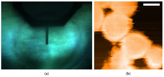 Before the indentation, the location and geometry of the cells need to be confirmed in the image mode. Due to the size of the HEK-293 cells, the adhesion force of adherent cells are very small at around 100 [,]. Hence, in order to decrease the impact from the lateral force on the adhesion of the target cells, the Z-axis controller force set point was set to be 0.1 to 0.3 , and the scanning speed was set as μm/s in the first scan. As illustrated in Figure 4b, the cells were scanned in static force mode by the AFM system, and the diameter of the cells from the top view, as well as the overall height information of the scanned area, can be obtained.