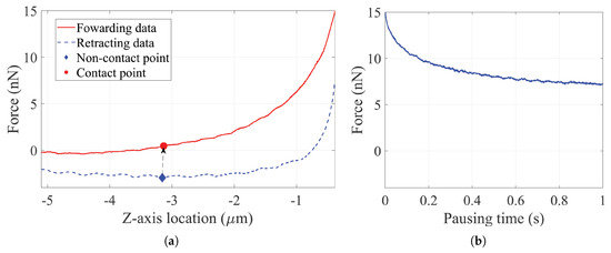 In single cell microinjection, capillary pressure microinjection (CPM) systems are widely utilized to mechanically penetrate the cell membrane []. In the process of indenting large spherical cells, the interaction force can be detected by piezoelectric force sensors, enabling force-feedback control to be performed [,]. Recent investigations into the micropositioning of samples has demonstrated accurate and efficient placement on micrometre and nanometre scales [,,,]. Image processing algorithms have also been adopted to trace the deformation of the indented cells in order to improve the automated microinjection of single cells [,,]. However, force sensors in CPM systems cannot accurately detect the nanonewton-scale interaction force between the capillary and the adherent cells []. For indenting adherent cells, atomic force microscopy (AFM) was introduced [], and the force-distance (F-D) curve in indentation was recorded [,]. Combining microfluidic system with nano-channelled AFM cantilevers, single cell microinjection was achieved on adherent cells using AFM [].