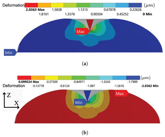The deformation of the hyperelastic components in the representative cross section when indentation distance reaches 2 μm: (a) total deformation (b) Z-axis deformation.